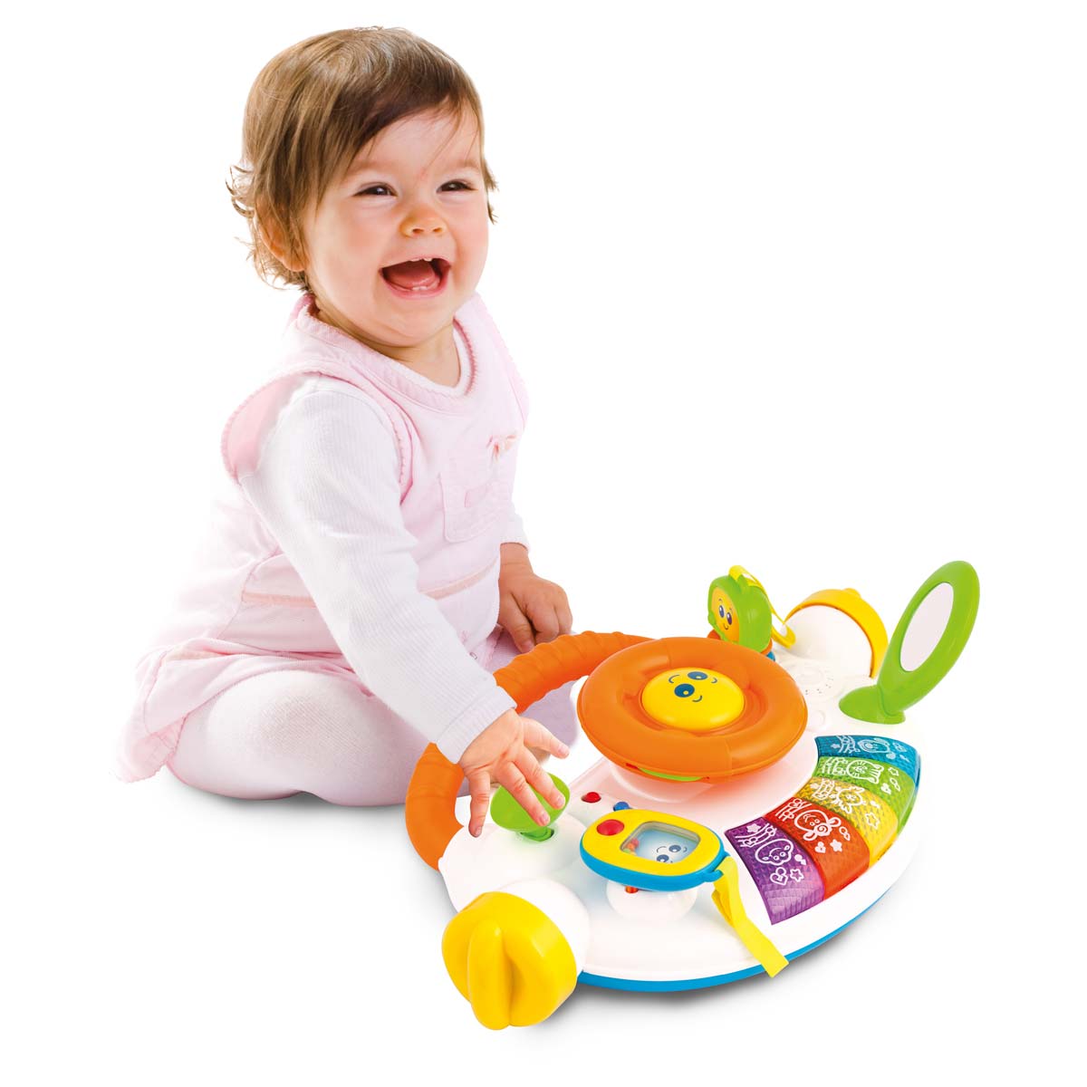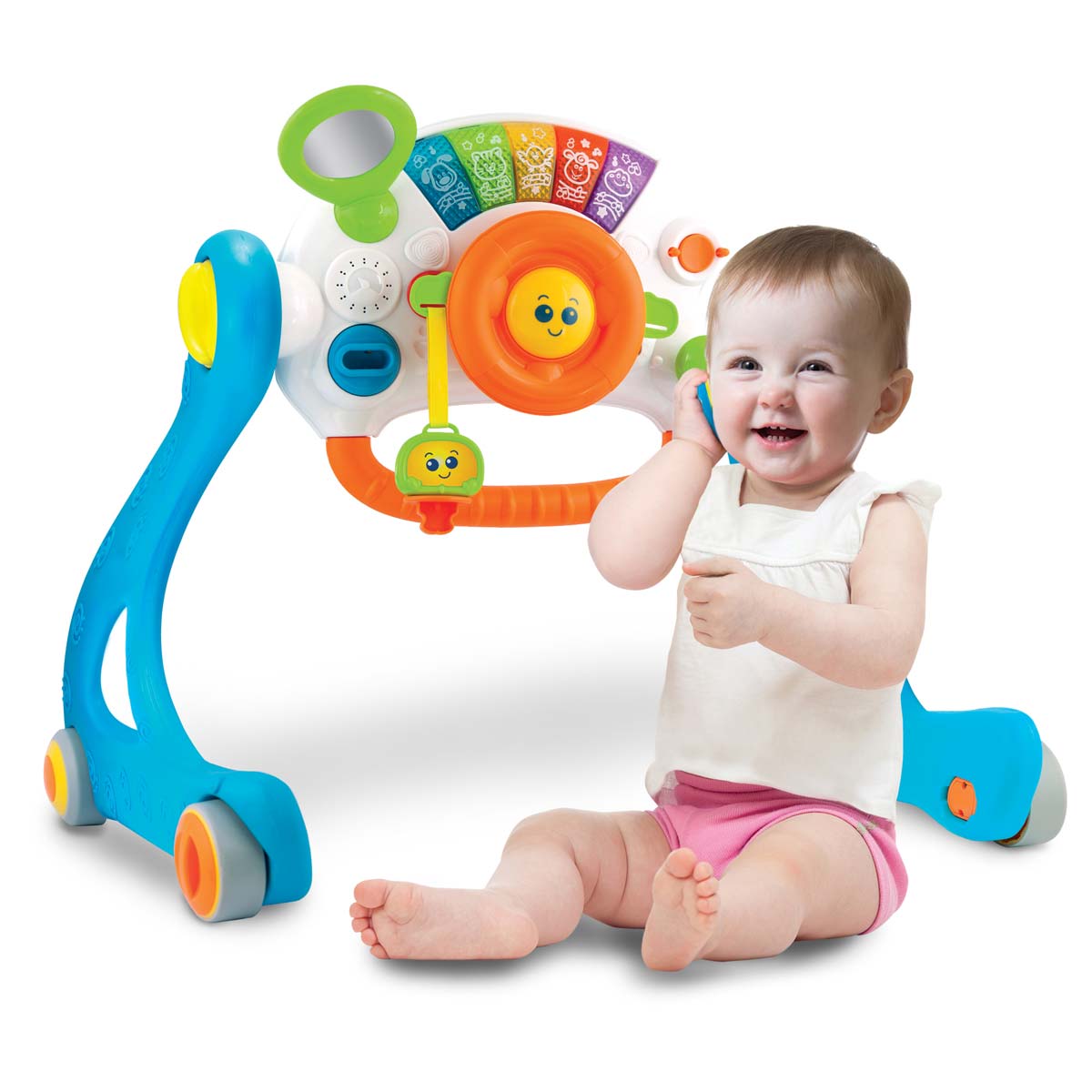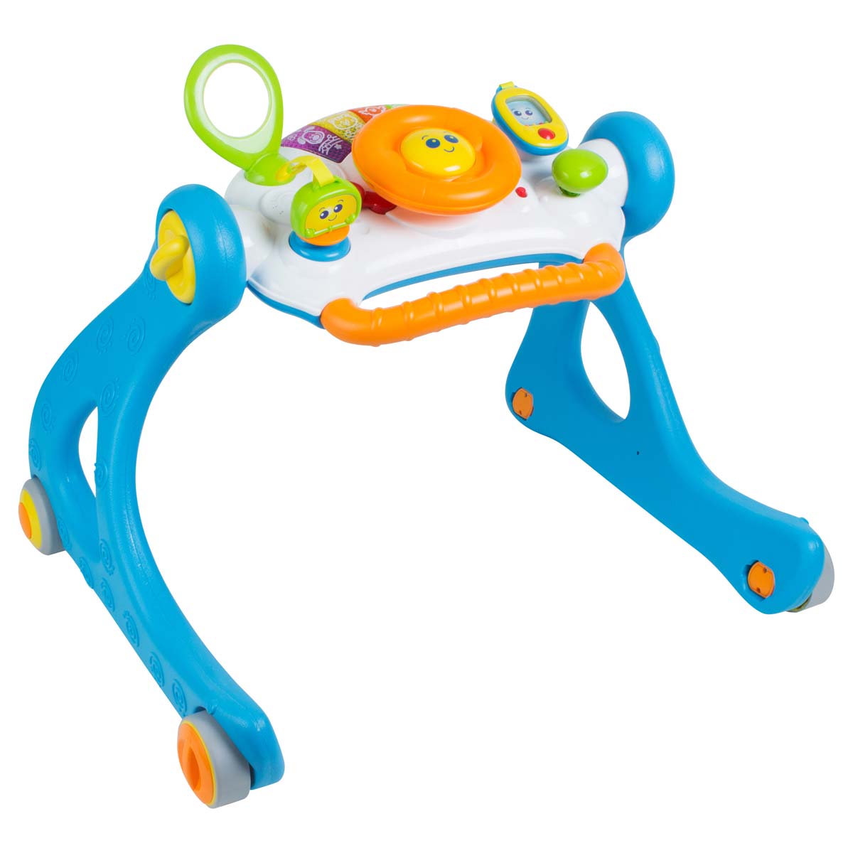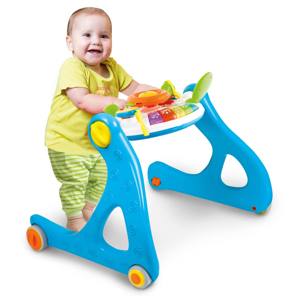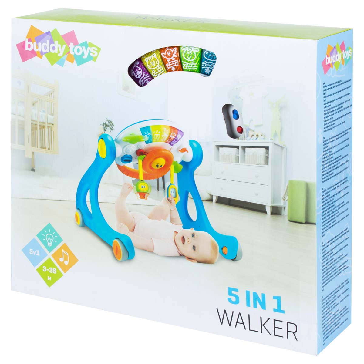 The 5 in 1 Walker is a practical toy for every baby. The adjustable play panel can be tilted to suit the age and the needs of the child. Usable as a play gym for laying / sitting / standing, the walker is helping children with their first steps and the play panel can be removed, ideal for travelling.