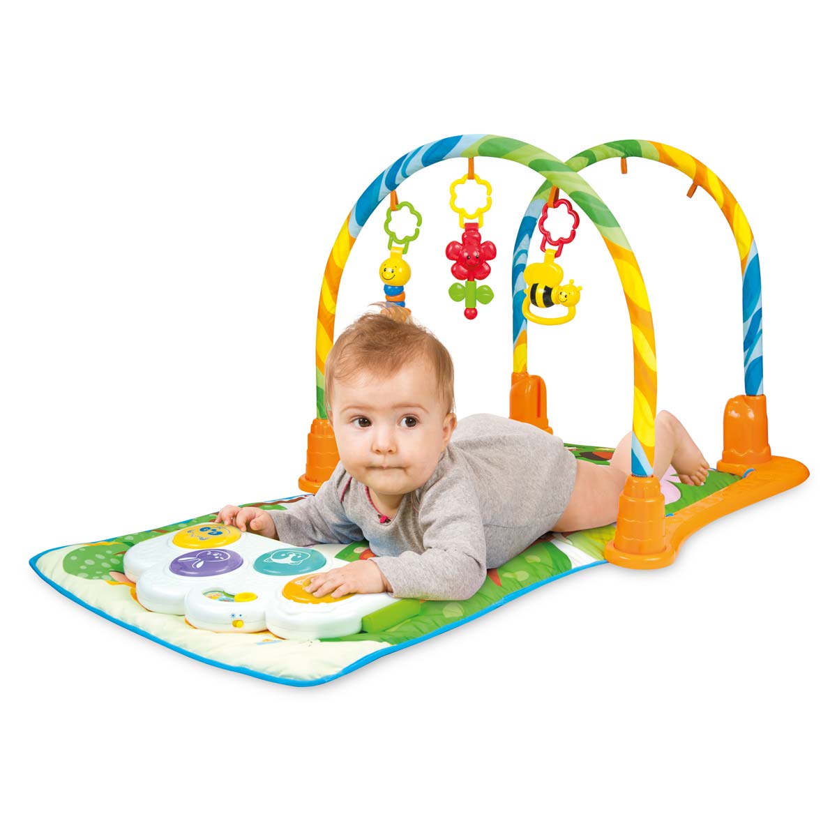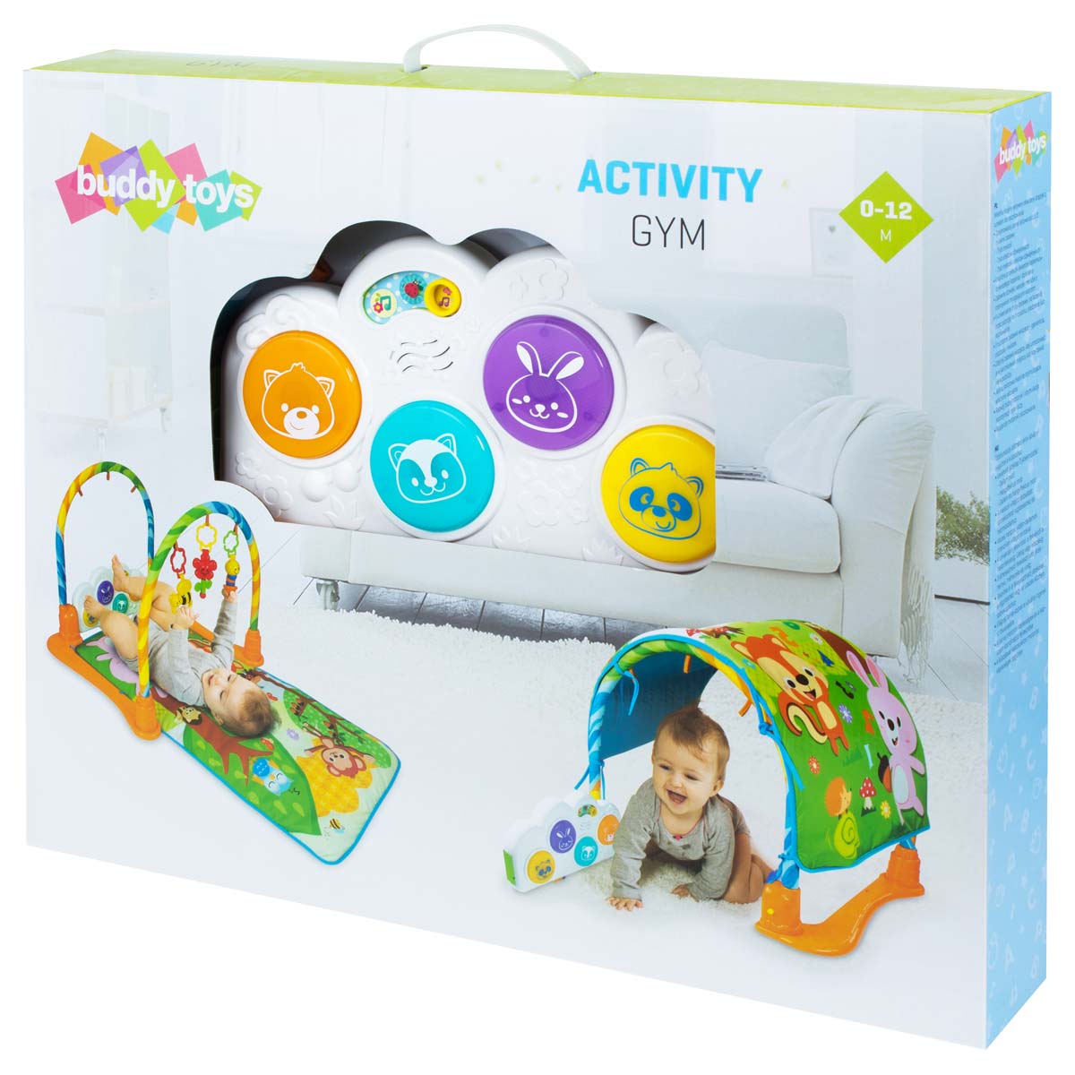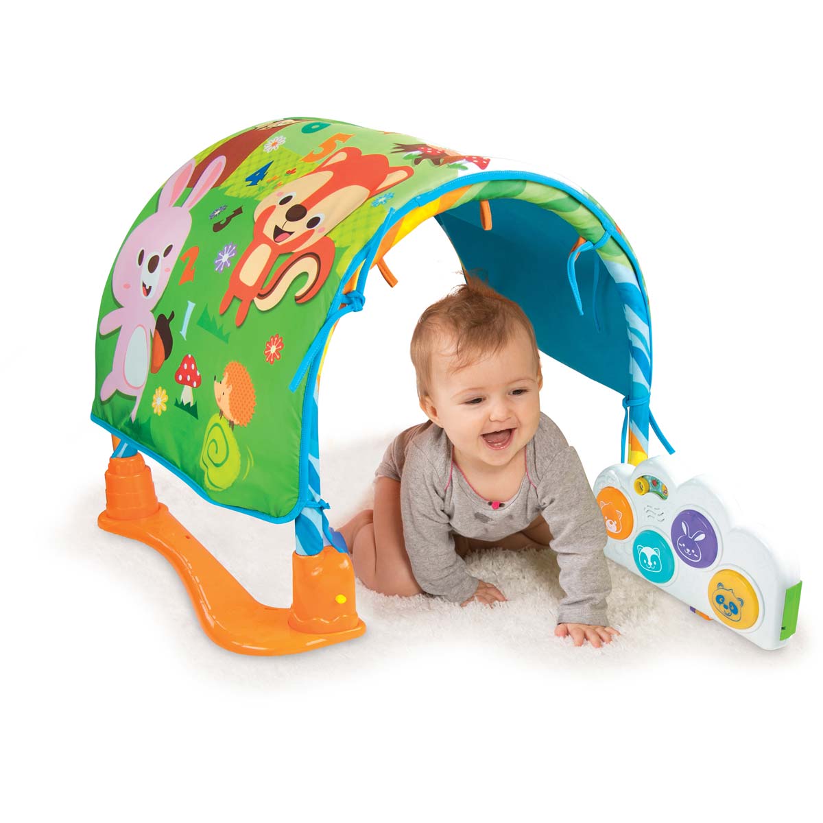 The play quilt with a tunnel is a multifunctional blanket with a bar and a tunnel. Four universal modes of playing – laying, tummy time, sitting, and crawling. Robust drum light pads are suitable for fun kicking and squeezing, and removable hanging toys are fit as small toys for travelling.