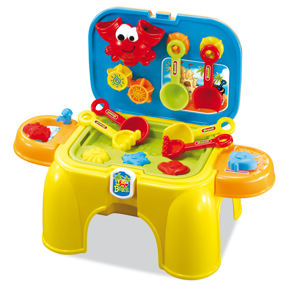Children's sandbox playset in a portable suitcase that can also be used as a chair for playful children.