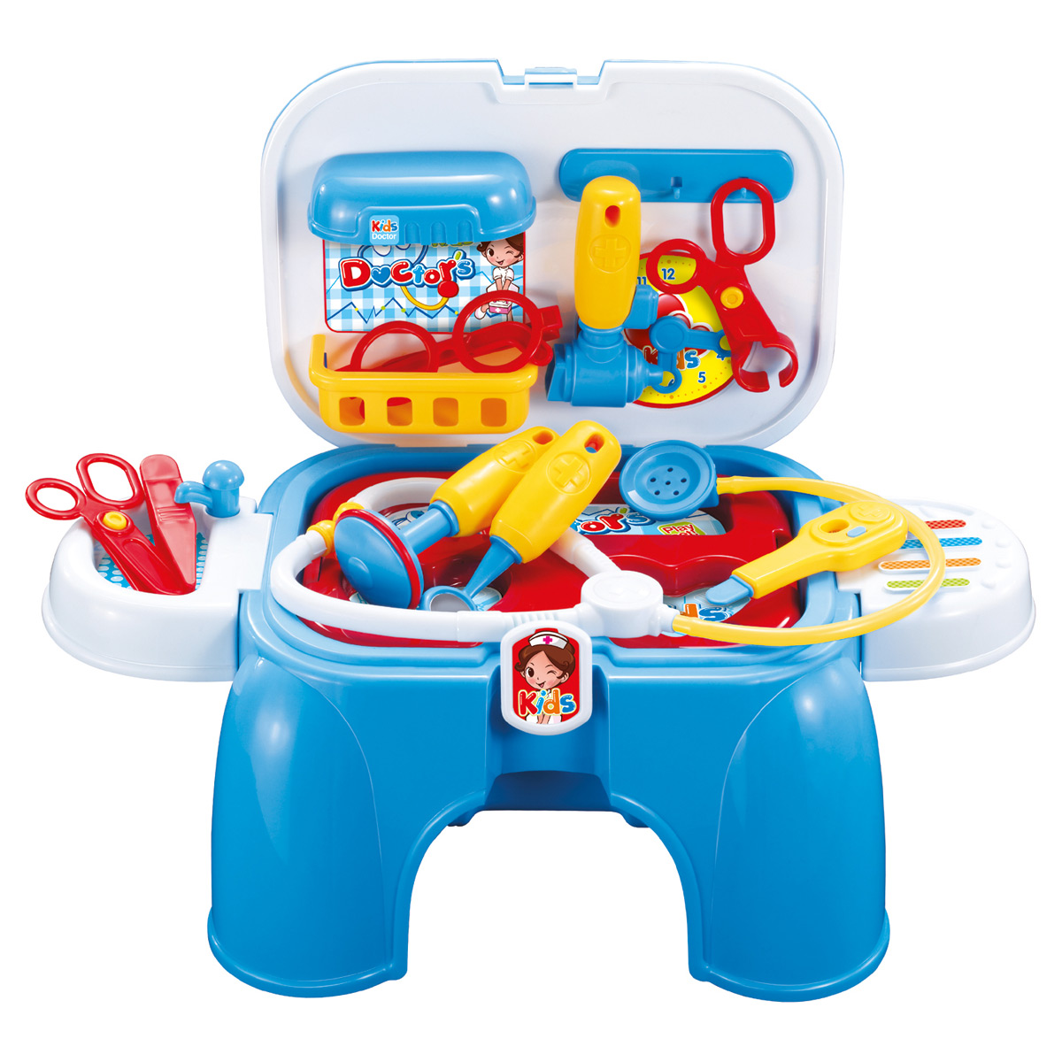 Children's healthcare playset in a portable suitcase that can also be used as a chair for playful children.