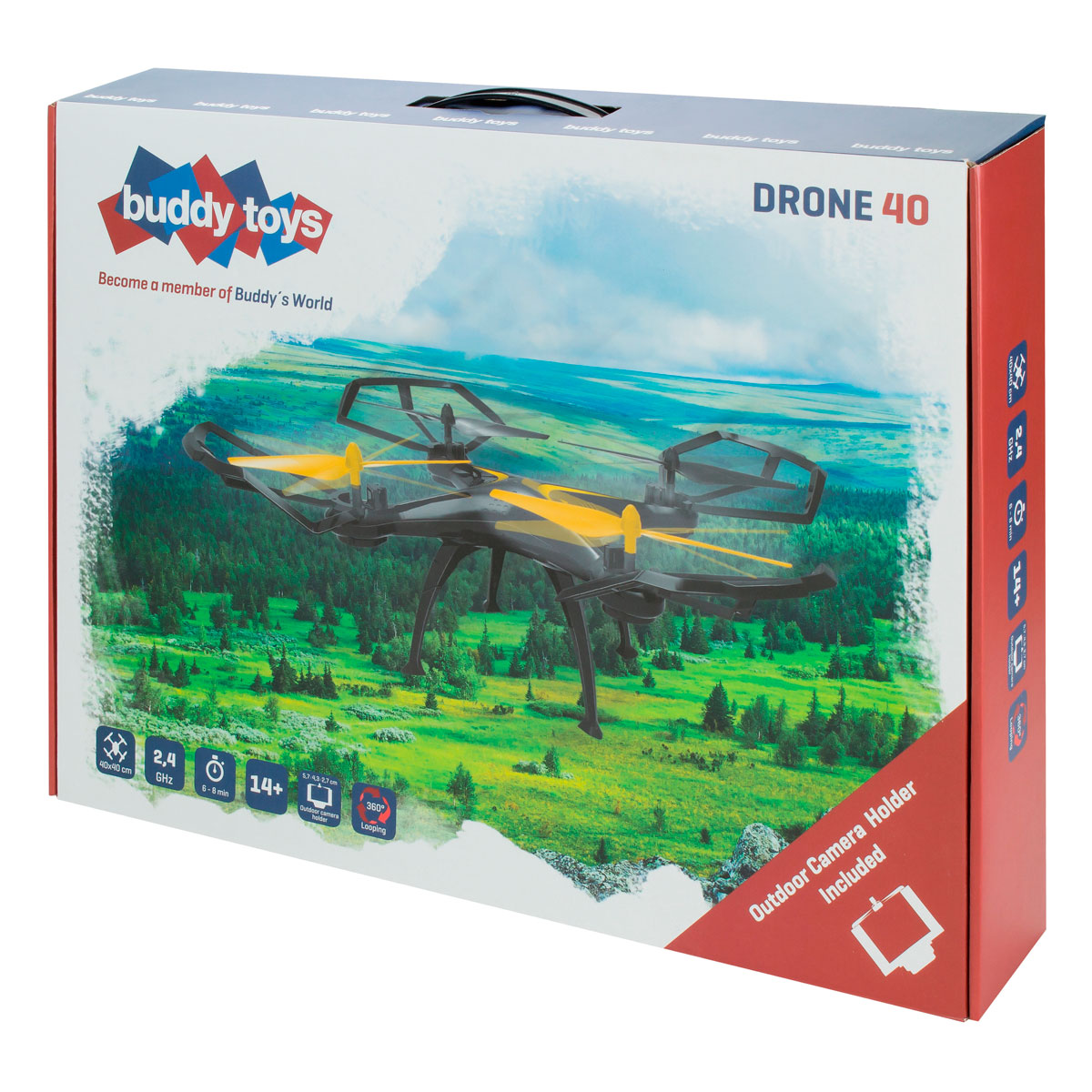 Drone 40 with the outdoor camera holder is a medium-sized aircraft with excellent flight characteristics. It is large enough for outdoor flights. For better orientation in space, it is equipped with green and red LEDs. Using the FLIP button, the drone can perform the basic acrobatics.