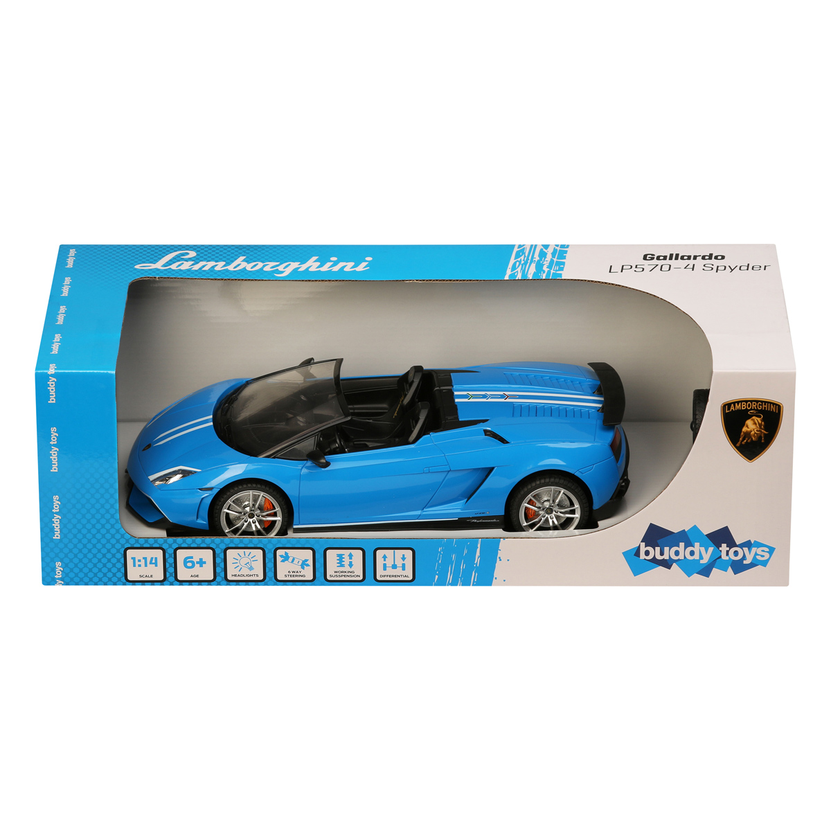 The Lamborghini Gallardo Spyder remote control toy car is manufactured based on the Super Sport from the famous Italian car maker, Lamborghini. Our toy car will captivate you with sophistication of many details, and it is made in the 01:14 scale. The toy car is equipped with a differential and rubber wheels to ensure better driving performance on slippery surfaces, as well as functional LED front and rear lights. The model speed ranges from 7 km/h to 10 km/h, depending on the battery age and performance. The car is controlled by a joystick with 10 meter reach