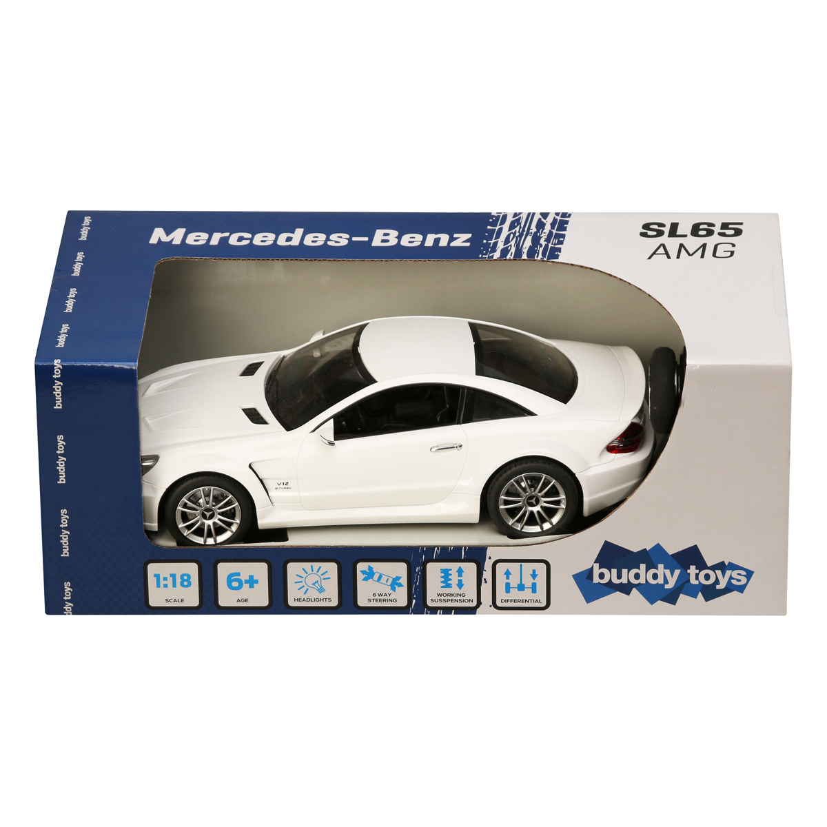 The remote control Mercedes Benz SL65 is a beast from the Black Series. The standard-looking roadster with a six-litre twin-turbo V12 engine features the 612 hp performance. Our model will captivate with sophistication of many details. The toy car is made in the 01:18 scale, and it is equipped with a differential and rubber wheels to ensure better driving performance on slippery surfaces, as well as functional LED front and rear lights. The model speed ranges from 7 km/h to 10 km/h, depending on the battery age and performance. The car is controlled by a joystick with 10 meter reach