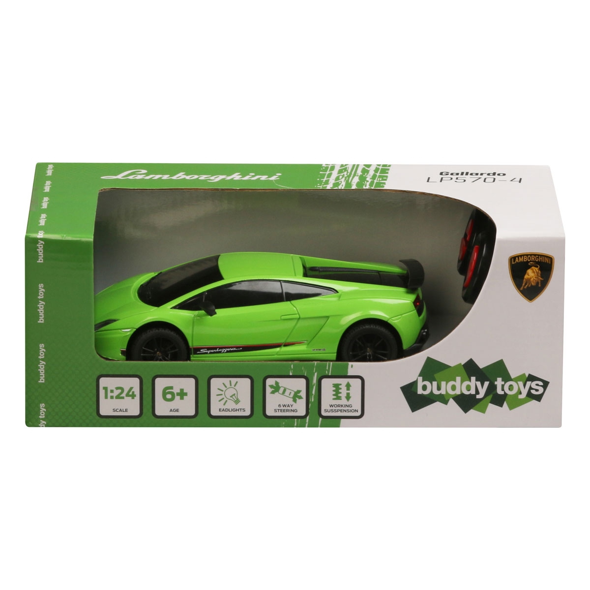 The Lamborghini Murcielago remote control toy car is manufactured based on the Super Sport from the famous Italian car maker, Lamborghini. Our toy car will captivate you with sophistication of many details, and it is made in the 01:24 scale. The toy car is equipped with a differential and rubber wheels to ensure better driving performance on slippery surfaces, as well as functional LED front and rear lights. The model speed ranges from 7 km/h to 10 km/h, depending on the battery age and performance. The car is controlled by a joystick with 10 meter reach