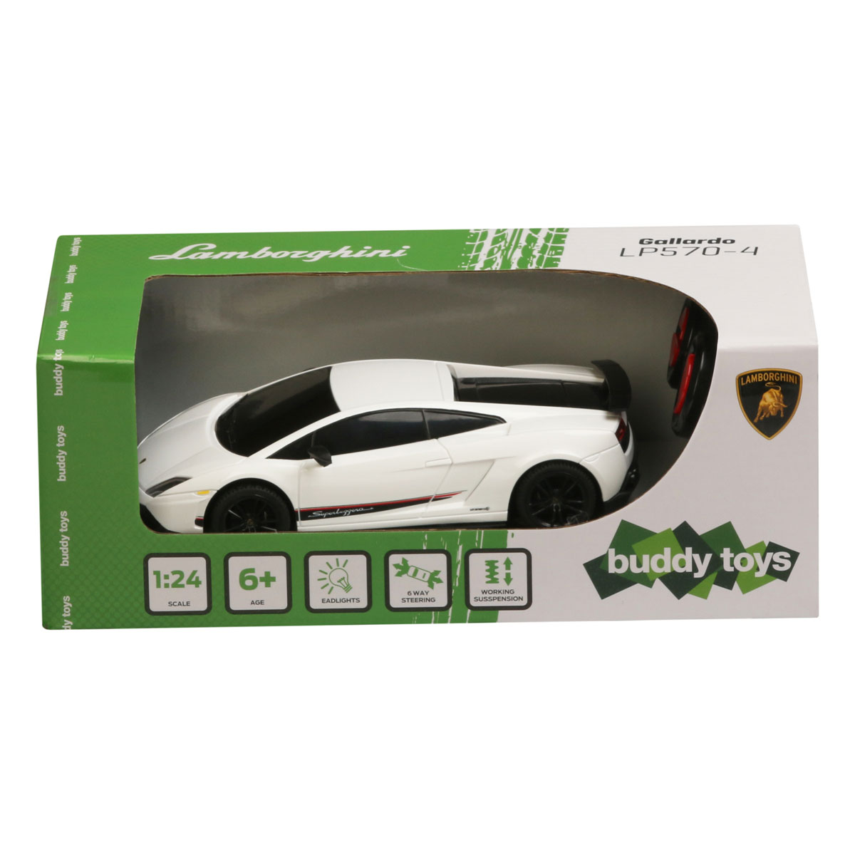 The Lamborghini Murcielago remote control toy car is manufactured based on the Super Sport from the famous Italian car maker, Lamborghini. Our toy car will captivate you with sophistication of many details, and it is made in the 01:24 scale. The toy car is equipped with a differential and rubber wheels to ensure better driving performance on slippery surfaces, as well as functional LED front and rear lights. The model speed ranges from 7 km/h to 10 km/h, depending on the battery age and performance. The car is controlled by a joystick with 10 meter reach