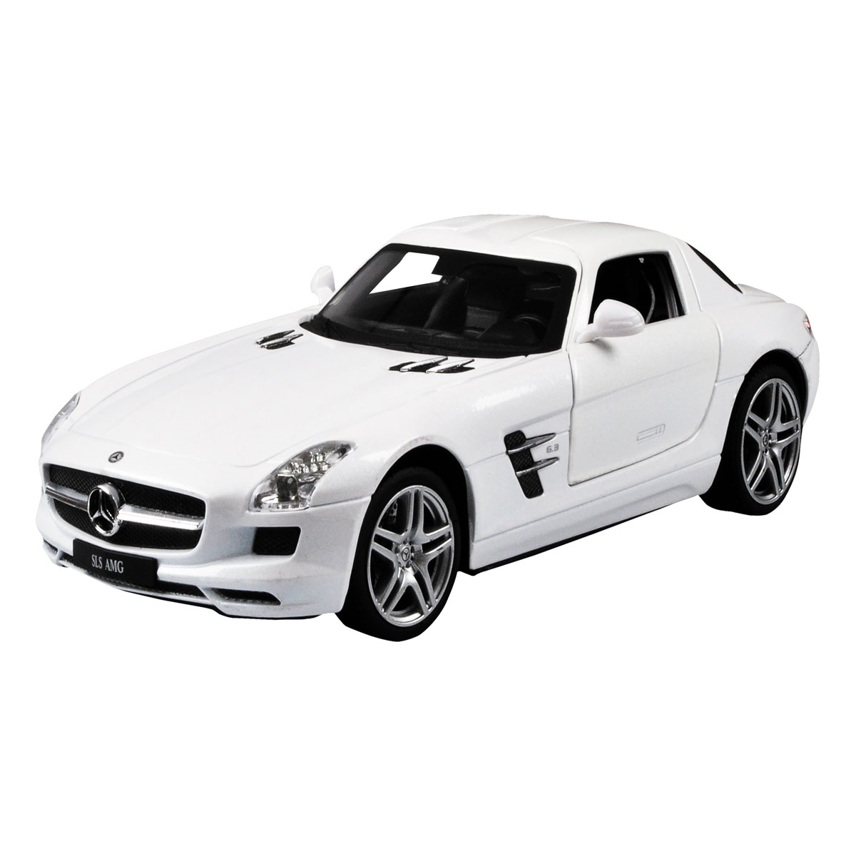 Mercedes-Benz SLS is the luxury Super Sport developed by Mercedes-AMG as the spiritual successor of the Mercedes-Benz 300 SL. Our toy car will captivate you with sophistication of many details, and it is made in the 01:24 scale. The toy car's body is made of metal and features butterfly doors. The car toy has rubber wheels to ensure better driving performance on slippery surfaces, as well as functional LED lights. The model speed ranges from 7 km/h to 10 km/h, depending on the battery age and performance. The car is controlled by a joystick with 10 meter reach