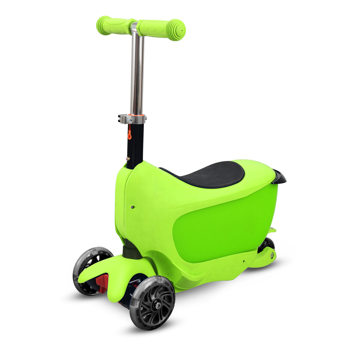 TAMAN 2in1 tipping scooter with three illuminated LED wheels for easy, safe, and stable driving of younger children. The scooter can be easily altered into a ride-on. The rear wheel has a safety brake. Handlebars have comfortable rubber grips so that children can hold them comfortably. It makes turns by tilting, which helps in learning balance and coordination.